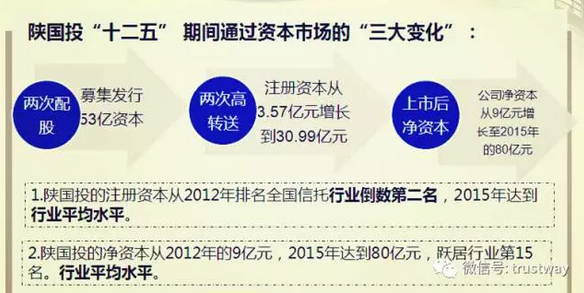 “2012年的時候,陜國投3.57億元的注冊資本在行業(yè)排名倒數(shù)第三?!毖久窀锌溃?015年,公司繼續(xù)把握住了資本市場階段性機(jī)會,完成了“十二五”時期的第二次增資擴(kuò)股,募集資本32億元,再次實(shí)施十送十,使公司注冊資本達(dá)到了30.9億元,凈資產(chǎn)達(dá)到80億元,資本實(shí)力進(jìn)入行業(yè)第一梯隊。