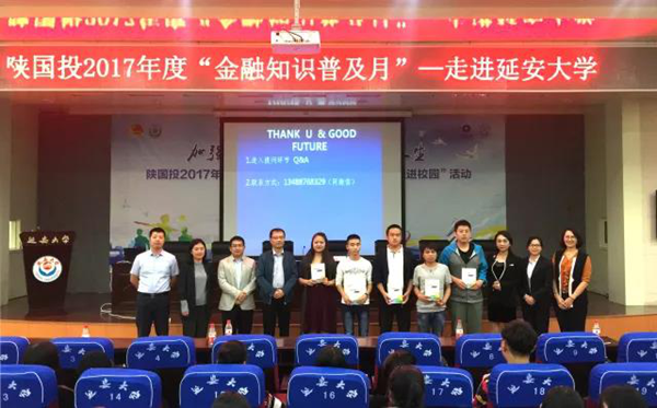 為積極落實(shí)《中國(guó)銀監(jiān)會(huì)辦公廳關(guān)于組織開展2017年“金融知識(shí)進(jìn)萬(wàn)家”宣傳服務(wù)月活動(dòng)的通知》和《關(guān)于開展2017年度陜西省“送金融知識(shí)進(jìn)校園”的活動(dòng)的通知》,9月28日公司總裁助理孫西燕帶隊(duì),財(cái)富管理總部副總經(jīng)理惠利等一行人走進(jìn)革命紅區(qū)延安大學(xué),在學(xué)校圖書館報(bào)告廳為300余名師生舉辦了“金融知識(shí)普及月”及“金融知識(shí)進(jìn)校園”活動(dòng),并赴革命紅區(qū)呼家川村舉辦了金融知識(shí)宣傳及觀影活動(dòng)。