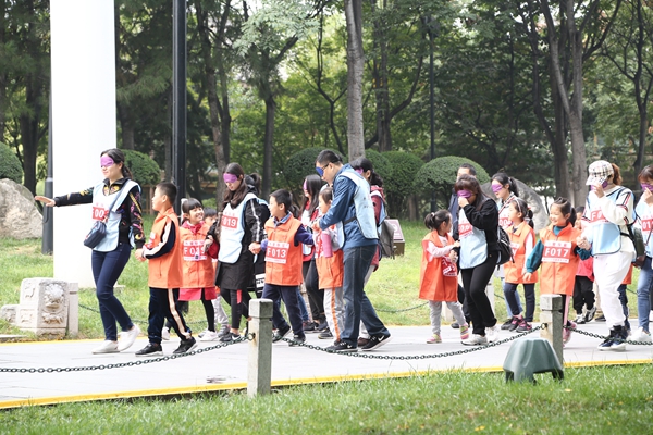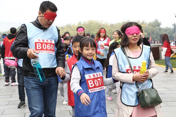 活動(dòng)現(xiàn)場(chǎng),近1000個(gè)小小志愿者和爸爸媽媽一起,手拉手陪伴100名視障兒童,共同環(huán)湖行走3.8公里。同時(shí),家長(zhǎng)們也蒙上眼罩,在小小志愿者引領(lǐng)下體驗(yàn)盲人的世界,以此培養(yǎng)“奉獻(xiàn)、友愛、互助、進(jìn)步”的志愿者精神。