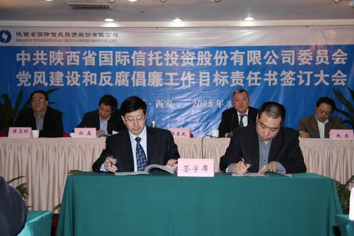 2008年3月31日,我公司在神州高速酒店唐廳召開了黨風建設和反腐倡廉目標責任書簽訂大會。公司黨委副書記、紀委書記黎惠民主持會議,并宣讀了《中共陜西省國際信托投資股份有限公司委員會2008年度黨風建設和反腐倡廉工作要點》;公司黨委書記、董事長薛季民同志分別與各部門(單位)負責人簽訂《部門(單位)黨風建設和反腐倡廉工作目標責任書》。會議要求各部門(單位)會后開展一次廉潔從業(yè)教育,并組織員工認真簽署《員工廉潔從業(yè)承諾書》。