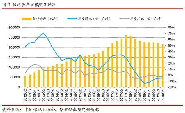 從2018年一季度開始,信托資產(chǎn)規(guī)模連續(xù)8個(gè)季度下滑。究其原因,一方面與監(jiān)管的收緊有關(guān),倒逼信托公司主要壓縮通道業(yè)務(wù)規(guī)模,持續(xù)向回歸信托本源、服務(wù)實(shí)體經(jīng)濟(jì)、強(qiáng)化主動(dòng)管理能力的方向轉(zhuǎn)變;另一方面,也與宏觀經(jīng)濟(jì)增速持續(xù)下臺(tái)階有關(guān),信用風(fēng)險(xiǎn)抬升,信托公司獲取合適資產(chǎn)的難度加大。到了2019年,這兩個(gè)因素依然存在,不過政策帶來的影響在邊際上有所改善。在經(jīng)濟(jì)下行壓力增大的背景下,宏觀政策逐步轉(zhuǎn)向“穩(wěn)增長(zhǎng)、穩(wěn)杠桿”,“寬貨幣+寬信用”的政策組合使得經(jīng)濟(jì)增速預(yù)期好轉(zhuǎn),融資需求有所回暖。同時(shí),央行關(guān)于資管業(yè)務(wù)的通知允許銀行自主制定整改計(jì)劃,有助于穩(wěn)定銀信合作中的銀行表內(nèi)和表外的資金規(guī)模,避免銀信合作規(guī)模過快下降。銀行理財(cái)可投非標(biāo)的明確規(guī)定將消除監(jiān)管不確定性,非標(biāo)資金端的改善有望帶來銀信融資類業(yè)務(wù)降幅趨緩。部分存量信托產(chǎn)品具有資金池特征,資管新規(guī)過渡期內(nèi)允許資金池類信托產(chǎn)品滾動(dòng)發(fā)行對(duì)接新資產(chǎn),有利于減緩信托規(guī)模的下降。這些積極因素推動(dòng)下,使得信托規(guī)模壓降的速度在2019年上半年有所放緩。不過在2019年下半年,對(duì)于通道業(yè)務(wù)和房地產(chǎn)信托的監(jiān)管加碼,通道業(yè)務(wù)和房地產(chǎn)信托業(yè)務(wù)均受到比較大的影響,信托規(guī)模壓降的速度重新擴(kuò)大。