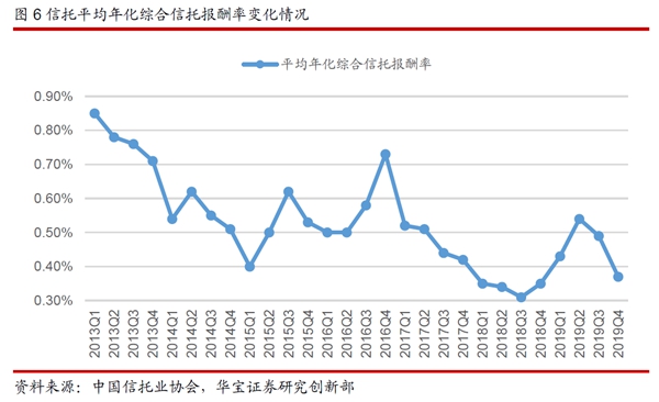 從上述兩個(gè)角度來分析信托產(chǎn)品的結(jié)構(gòu)我們可以發(fā)現(xiàn),“資管新規(guī)”落地后,通道與多層嵌套業(yè)務(wù)不斷清理與壓縮,信托公司主動(dòng)管理能力增強(qiáng),信托業(yè)務(wù)結(jié)構(gòu)優(yōu)化。這帶動(dòng)了信托報(bào)酬率從2018年四季度開始連續(xù)3個(gè)季度的回升,2019年二季度平均年化綜合報(bào)酬率為0.54%,相對(duì)于2018年三季度的階段性低點(diǎn)提高0.23個(gè)百分點(diǎn)。不過由于2019年下半年監(jiān)管部門加大了風(fēng)險(xiǎn)排查的力度和頻率,之前被隱匿的風(fēng)險(xiǎn)得到了更加充分的暴露,使得信托報(bào)酬率在下半年出現(xiàn)了回落。