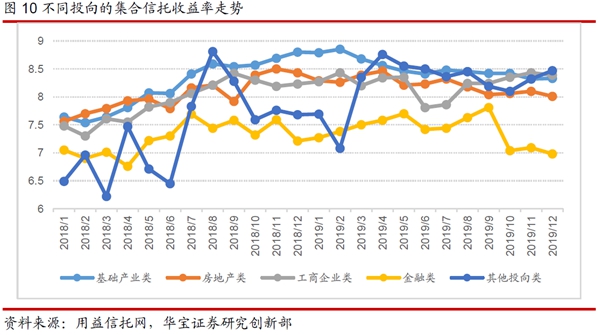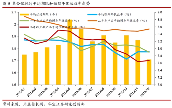 產(chǎn)品收益:根據(jù)用益信托網(wǎng)不完全數(shù)據(jù)顯示,2019年,已公布的集合理財(cái)類信托產(chǎn)品的平均收益率為8.16%,與2018年相比平均收益率上行22個(gè)bp;其平均信托年限為1.86年,與2018年持平。從預(yù)期年化收益率的趨勢(shì)來看,2019年月度新發(fā)集合信托平均預(yù)期年收益率呈明顯的下降趨勢(shì)。疫情加大經(jīng)濟(jì)衰退風(fēng)險(xiǎn),全球流動(dòng)性大幅投放,“資產(chǎn)荒”的壓力進(jìn)一步增大,預(yù)計(jì)2020 年集合信托產(chǎn)品的平均預(yù)期收益率仍然有一定的下行空間。