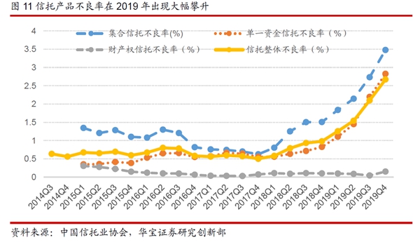不良率快速攀升。具體來看,信托整體的不良率由2018年末的0.98%上升至2019年末的2.67%,不良率上升1.69個(gè)百分點(diǎn);集合信托的不良率由2018年末的1.51%上升至2019年末的3.48%,上升了1.97個(gè)百分點(diǎn);單一資金信托的不良率由2018年末的0.83%上升至2019年末的2.82%,上升了2個(gè)百分點(diǎn)。2019年單一資金信托的不良率上升的比集合信托要快,不過當(dāng)前集合信托的不良率仍高于單一資金信托。