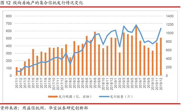 投向房地產(chǎn)的信托規(guī)模為2.70萬億,較2018年末增加165億元,規(guī)模占比為15.07%,上升0.89個(gè)百分點(diǎn)。2019年下半年地產(chǎn)融資收緊之前,“寬信用”的政策基調(diào)下,房地產(chǎn)面臨的融資環(huán)境比較友好。同時(shí)地產(chǎn)銷售階段性的好轉(zhuǎn)疊加房企執(zhí)行“高周轉(zhuǎn)”的戰(zhàn)略,加速推盤,加速開工,融資需求明顯回升,帶動(dòng)了2019年上半年房地產(chǎn)信托融資的大幅回升。到了下半年,由于地產(chǎn)融資收緊,房地產(chǎn)信托的發(fā)行也受到了一定的影響。