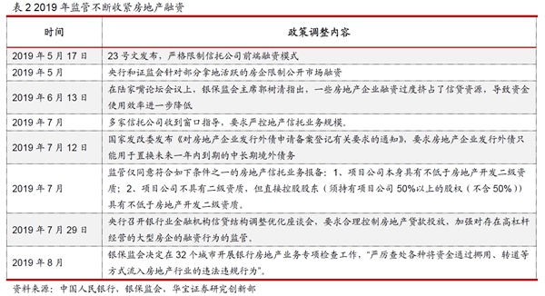 2016年國(guó)慶之后,盡管房地產(chǎn)調(diào)控政策不斷收緊,但是地產(chǎn)投資受到的影響比較小,地產(chǎn)投資增速持續(xù)上漲后維持在高位,2017-2019年三年房地產(chǎn)投資增速分別為7%、9.5%和9.9%,同時(shí)限購(gòu)、限價(jià)、限貸、限售政策對(duì)于房地產(chǎn)開發(fā)商的資金回收形成較大影響,同時(shí)銀行等常規(guī)融資渠道也受到了限制,信托融資由于其靈活性受到了地產(chǎn)商的青睞。隨著2018年資管新規(guī)及其配套的各項(xiàng)政策的落地,政策的不確定性消除之后,房地產(chǎn)融資出現(xiàn)明顯回升,一直持續(xù)到2019年上半年。由于在2019年5月份開始政策對(duì)房地產(chǎn)的融資監(jiān)管進(jìn)一步收緊,2019年下半年地產(chǎn)融資明顯回落。