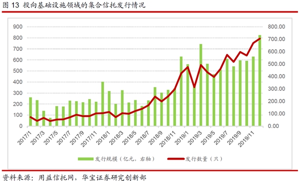 2019年末,投向基礎(chǔ)產(chǎn)業(yè)的信托規(guī)模為2.82萬億,較2018年末增加565億元,規(guī)模占比為15.72%,上升1.13個(gè)百分點(diǎn)。去年四季度《國(guó)務(wù)院辦公廳關(guān)于保持基礎(chǔ)設(shè)施領(lǐng)域補(bǔ)短板力度的指導(dǎo)意見》出臺(tái),提示地方政府化解隱性債務(wù)風(fēng)險(xiǎn),防范出現(xiàn)系統(tǒng)性金融風(fēng)險(xiǎn),增強(qiáng)了金融機(jī)構(gòu)對(duì)平臺(tái)公司融資的信心,信政合作業(yè)務(wù)迎來政策“拐點(diǎn)”。隨著中美貿(mào)易摩擦的持久化,面對(duì)國(guó)內(nèi)外風(fēng)險(xiǎn)挑戰(zhàn)明顯增多的復(fù)雜局面,作為國(guó)家逆周期調(diào)節(jié)的重要手段,2019年政策一直推進(jìn)基建投資的回升,基礎(chǔ)產(chǎn)業(yè)融資需求有所回升。