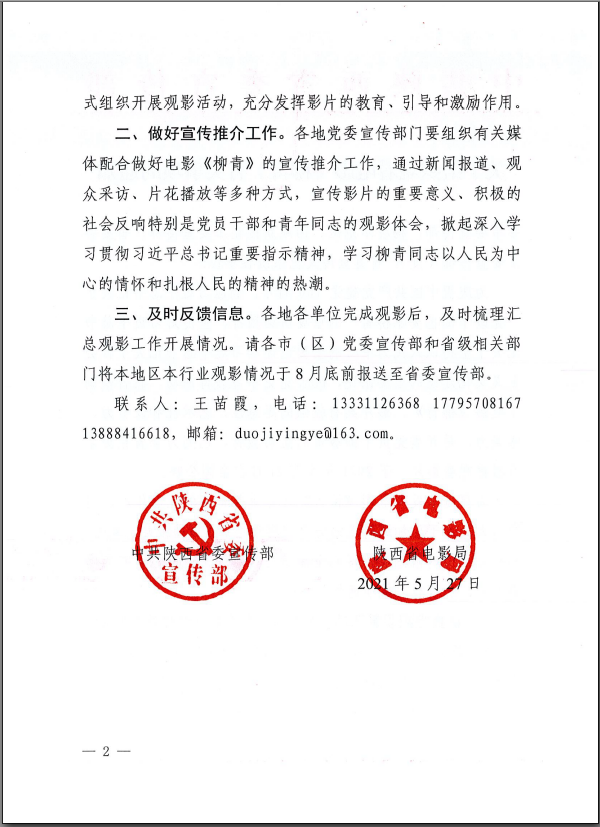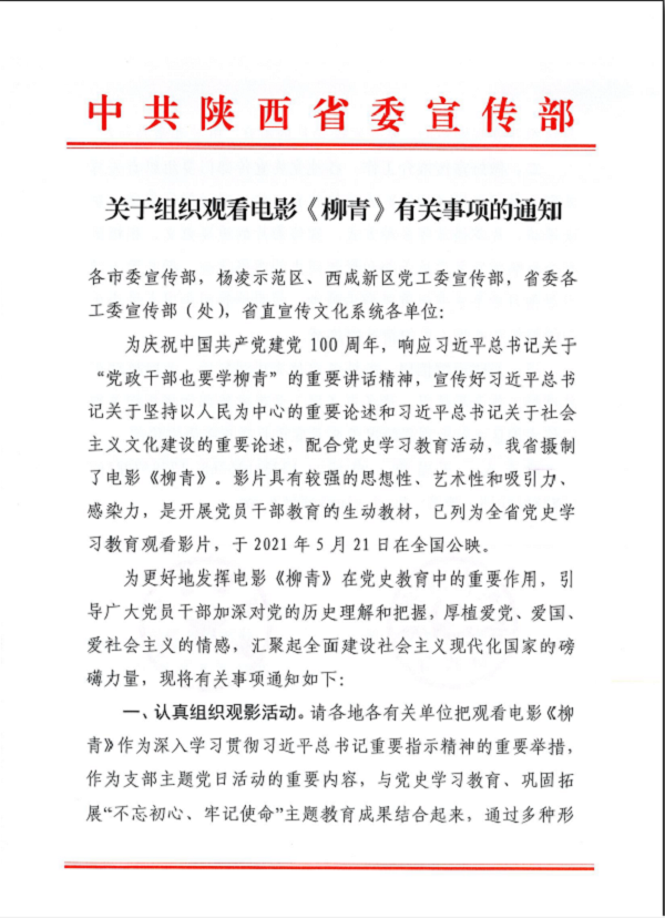 中共陜西省委宣傳部關(guān)于組織觀看電影《柳青》有關(guān)事項的通知