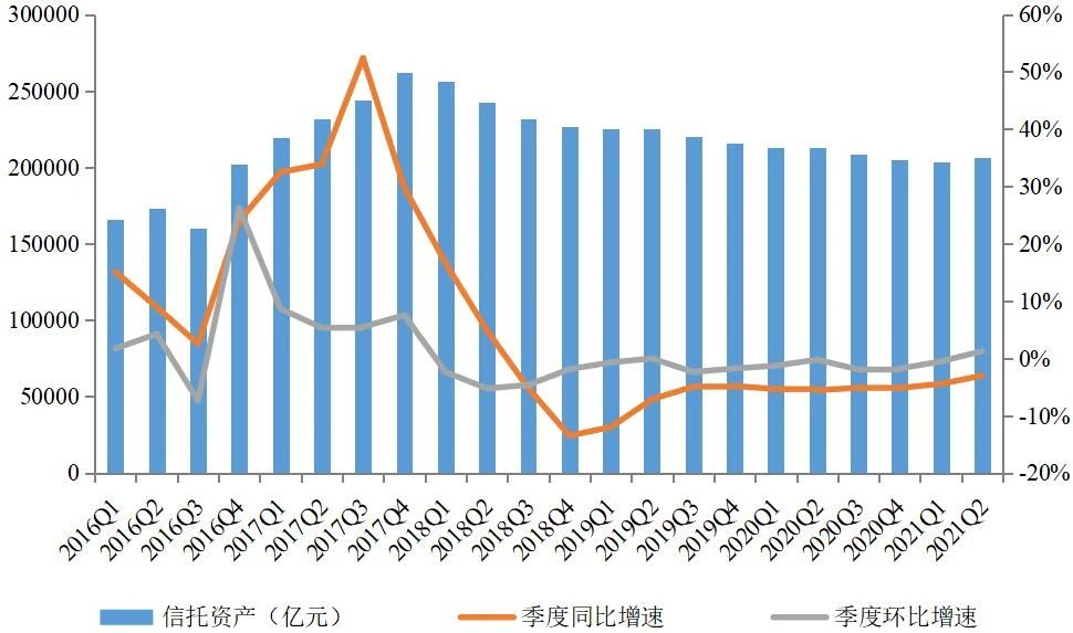 資管新規(guī)發(fā)布以來,信托業(yè)進(jìn)入艱難轉(zhuǎn)型階段,信托資產(chǎn)規(guī)模從2017年4季度末的高點(diǎn)持續(xù)滑落。隨著資管新規(guī)過渡期臨近結(jié)束,信托資產(chǎn)規(guī)模漸趨平穩(wěn),并在2021年2季度首次出現(xiàn)回升。截至2021年2季度末,信托資產(chǎn)規(guī)模為20.64萬億元,與2020年2季度末相比,同比下降0.64萬億元,降幅為3.02%;與2021年1季度末相比,環(huán)比增加0.26萬億元,增幅為1.28%。