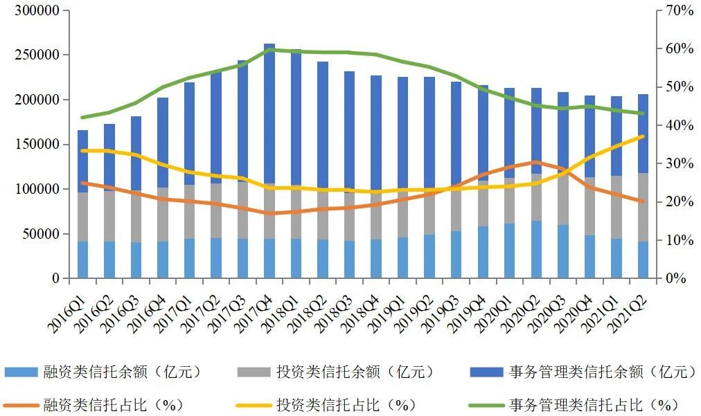 投資類信托是信托公司向主動(dòng)管理轉(zhuǎn)型的重要領(lǐng)域。2020年2季度以來,投資類信托快速發(fā)展,規(guī)模迅速接近事務(wù)管理類信托。截至2021年2季度末,投資類信托規(guī)模增至7.64萬億元,同比大幅增長(zhǎng)45.33%,環(huán)比增長(zhǎng)8.96%;投資類信托占比升至37.00%,同比上升12.31個(gè)百分點(diǎn),環(huán)比上升2.61個(gè)百分點(diǎn)。