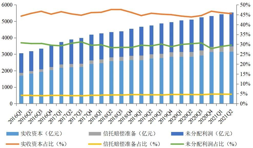 從所有者權(quán)益的構(gòu)成來看,實(shí)收資本和信托賠償準(zhǔn)備均出現(xiàn)較明顯的增長(zhǎng)。截至2021年2季度末,實(shí)收資本為3153.99億元,同比增長(zhǎng)10.78%,環(huán)比增長(zhǎng)0.39%;實(shí)收資本占比為45.54%,同比上升1.69個(gè)百分點(diǎn),環(huán)比降低0.48個(gè)百分點(diǎn)。