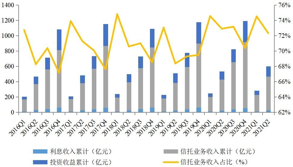 從收入結(jié)構(gòu)來看,信托業(yè)務(wù)收入是信托公司最主要的收入來源,繼續(xù)保持良好的穩(wěn)定性。截至2021年2季度末,信托公司實(shí)現(xiàn)信托業(yè)務(wù)收入435.55億元,同比增長(zhǎng)8.52%;信托業(yè)務(wù)收入占比為72.31%,同比降低0.59個(gè)百分點(diǎn)。