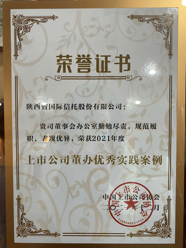 公司從參評(píng)的200多家中國(guó)上市公司協(xié)會(huì)職務(wù)會(huì)員單位中脫穎而出,榮獲“2021年度上市公司董辦優(yōu)秀實(shí)踐案例”,也是陜西本次入選的2家上市公司之一。
