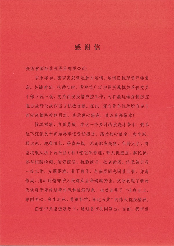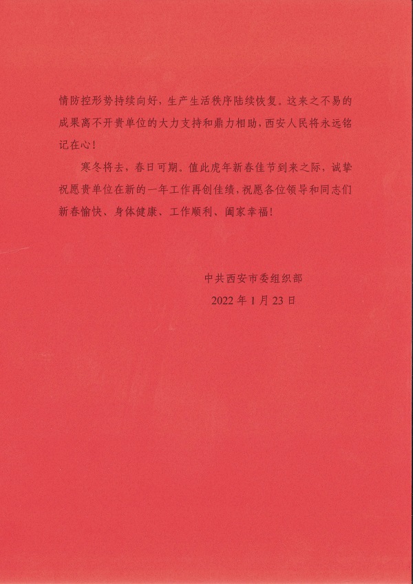 公司收到中共西安市委組織部發(fā)來的感謝信