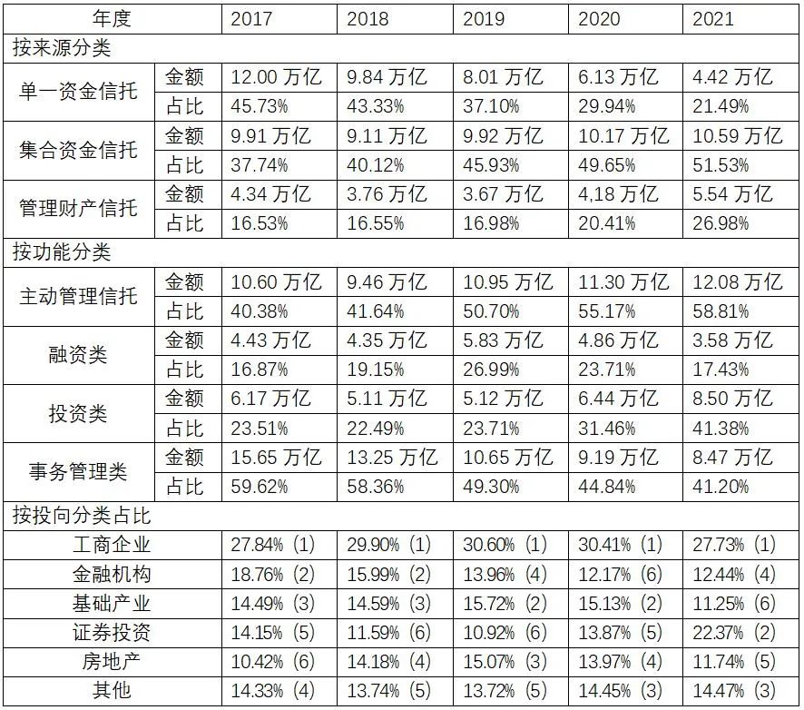 表二 2017-2021年信托業(yè)務(wù)結(jié)構(gòu)變化一覽