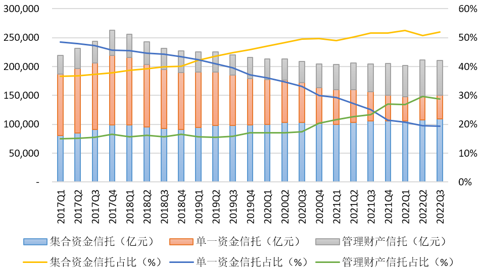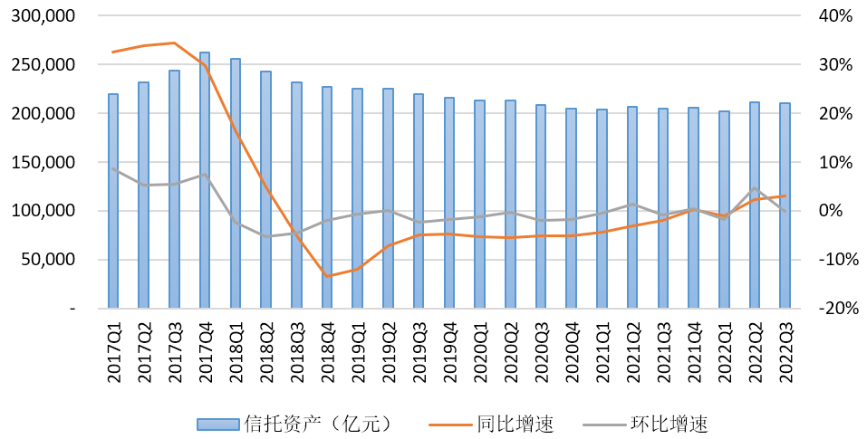 2022年3季度以來,隨著穩(wěn)經(jīng)濟一攬子政策措施落地顯效,國內(nèi)經(jīng)濟動能恢復明顯,季度國內(nèi)生產(chǎn)總值同比增長3.9%,較上季度改善3.4個百分點。但是,當前全球經(jīng)濟滯脹和衰退風險較大,國際地緣政治局勢復雜,國內(nèi)受消費持續(xù)不振、房地產(chǎn)繼續(xù)低迷、出口支撐走弱等因素影響,經(jīng)濟復蘇基礎并不牢固。信托業(yè)以習近平新時代中國特色社會主義思想為指導,今年以來,堅持“穩(wěn)字當頭、穩(wěn)中求進”的工作總基調(diào),資產(chǎn)規(guī)模保持平穩(wěn),業(yè)務結構持續(xù)優(yōu)化,風險化解繼續(xù)深化,經(jīng)營業(yè)績有所回調(diào)。站在新的歷史方位,信托業(yè)將認真貫徹落實黨的二十大精神,以推動高質量發(fā)展為主線,堅持金融的政治性和人民性,堅定回歸信托本源,在服務實體經(jīng)濟、服務人民生活需要,防范化解金融風險中積極作為,積極探索開拓中國特色的信托金融發(fā)展之路。