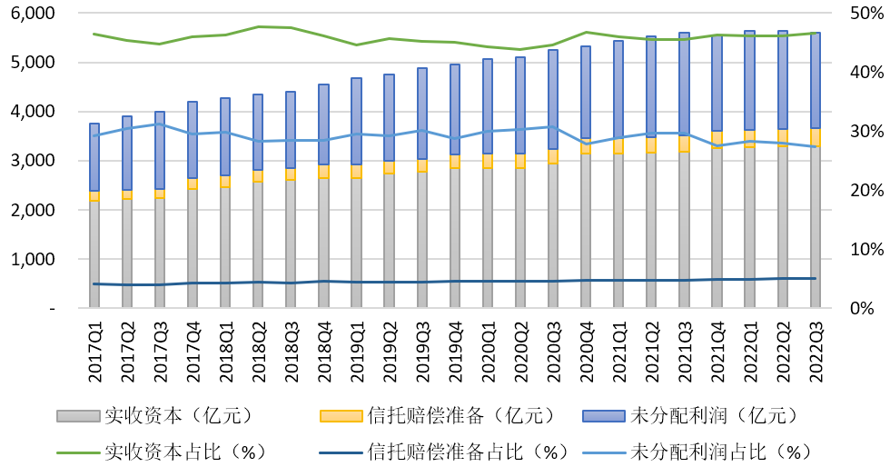 二是所有者權益內(nèi)部結構基本保持穩(wěn)定。實收資本一直是所有者權益中最主要組成部分,截至2022年3季度末,全行業(yè)實收資本為3299.79億元,同比增長112.58億元,增幅3.53%,環(huán)比增長0.46%,在所有者權益中的占比達到了46.56%,同比提升1.07個百分點。3季度末未分配利潤達到1943.39億元,同比下降138.87億元,降幅6.67%,環(huán)比下降2.35%,與部分機構通過未分配利潤轉增資本和現(xiàn)金分紅有關,在所有者權益中占比27.42%,同比降低2.3個百分點。信托賠償準備保持較快增長,3季度末規(guī)模為355.35億元,同比增長25.69億元,增幅7.79%,環(huán)比略降2.32%,在所有者權益中占比為5.01%,同比上升了0.31個百分點。