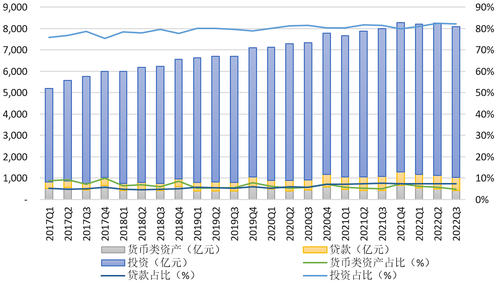 三是固有資產(chǎn)中投資運用方式進一步占據(jù)主導。2022年3季度末固有資產(chǎn)通過投資方式運用的規(guī)模達到7041.78億元,同比增長108.76億元,增幅1.57%,環(huán)比降低1.06%,占比達到82.24%,同比進一步提升0.71個百分點,且2022年連續(xù)3個季度的占比均保持在80%以上。貸款方式運作的規(guī)模為628.73億元,同比下降22.58億元,降幅3.47%,環(huán)比下降1.27%,占比為7.34%,同比略降0.32個百分點,相對占比自2018年2季度跌至谷底以后總體保持小幅回升態(tài)勢。貨幣類資產(chǎn)規(guī)模為412.53億元,同比下降2.88%,環(huán)比下降16.40%,占比4.82%,同比略降0.18個百分點,占比總體呈現(xiàn)持續(xù)下降態(tài)勢。