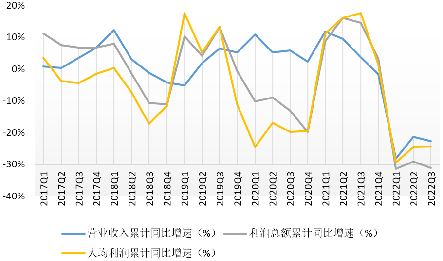截至2022年3季度,全行業(yè)累計實現(xiàn)利潤總額為383.01億元,同比下降173.75億元,降幅31.21%,下降幅度略高于經(jīng)營收入的降幅,一定程度上反映出當前行業(yè)轉型發(fā)展中的挑戰(zhàn),一方面創(chuàng)新業(yè)務布局要加大科技、創(chuàng)新人才等基礎性投入,成本費用支出明顯增長,但短期利潤貢獻尚不明顯;另一方面由于行業(yè)風險資產(chǎn)暴露增加,信托公司加大資產(chǎn)減值計提力度,一定程度上削弱了盈利水平。截至2022年3季度,行業(yè)人均凈利潤140.30萬元,同比下降45.34億元,降幅24.42%,人均凈利潤指標自2022年以來已經(jīng)連續(xù)3個季度處于負增長狀態(tài),也反映出當前行業(yè)轉型過程中持續(xù)盈利能力面臨的考驗。
