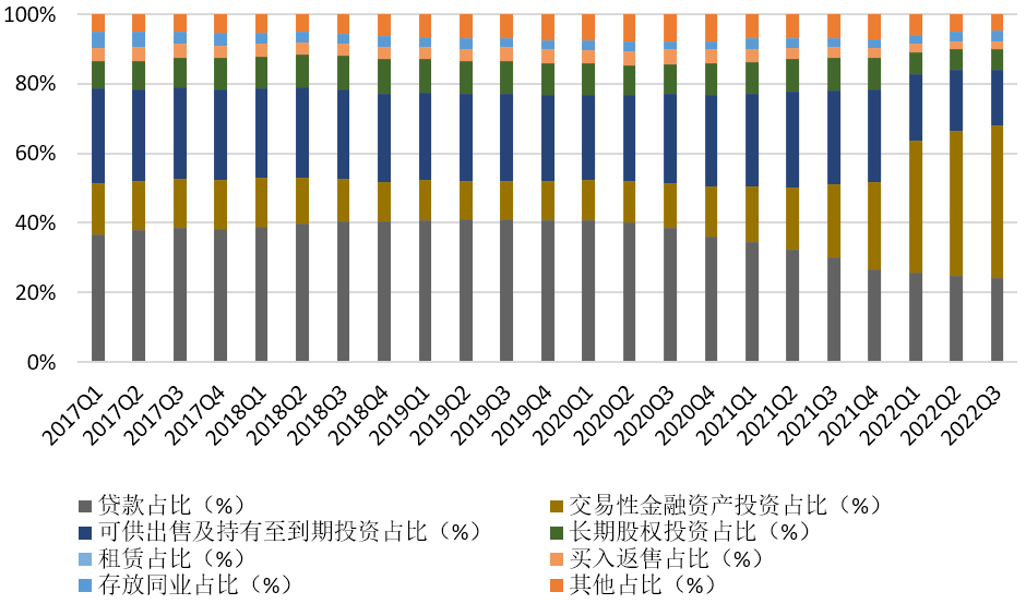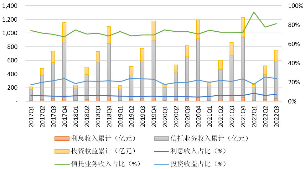 截至2022年3季度末,行業(yè)信托業(yè)務收入在經(jīng)營收入中的占比上升到81.32%,同比提升8.87個百分點。從2022年前三季度總體情況看,信托業(yè)務收入占比分別達到93.43%、77.78%、81.32%,均高于過去歷年同期的水平,信托主業(yè)地位日益鞏固。