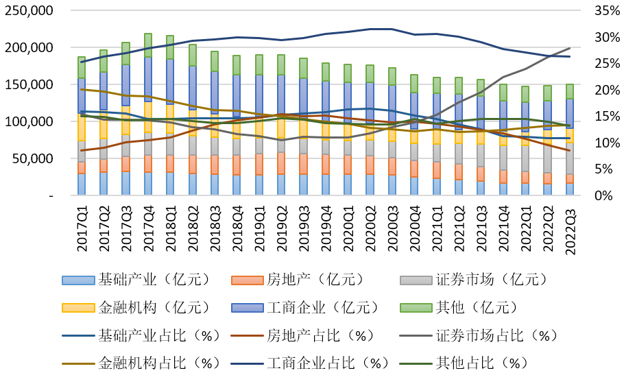 2.投向工商企業(yè)、基礎產(chǎn)業(yè)、房地產(chǎn)領域的規(guī)模和占比進一步下降。當前實體經(jīng)濟增速回落,投融資需求有所減弱,房地產(chǎn)等重點領域風險暴露,對信托業(yè)務的傳統(tǒng)投向領域帶來一定影響。一是投向工商企業(yè)的資金信托規(guī)模在2022年3季度末為3.95萬億元,同比下降0.59萬億元,降幅13.07%,環(huán)比增長0.95%;較2021年末規(guī)模下降5.00%;占比下降至26.33%,同比下降2.69個百分點,環(huán)比下降0.04個百分點。二是投向基礎產(chǎn)業(yè)的資金信托規(guī)模為1.63萬億元,同比下降0.33萬億元,降幅17.04%,環(huán)比增長1.57%;較2021年末規(guī)模降低3.55%;占比下降至10.84%,同比下降1.68個百分點,環(huán)比下降0.05個百分點。三是投向房地產(chǎn)的資金信托規(guī)模為1.28萬億元,同比下降0.67萬億元,降幅34.20%,環(huán)比下降9.49%;較2021年末規(guī)模降低27.30%;占比下降至8.53%,同比下降3.89個百分點,環(huán)比下降1個百分點。此外,投向其他的資金信托規(guī)模為1.97萬億元,同比下降0.29萬億元,降幅12.82%,環(huán)比下降4.87%;較2021年末規(guī)模降低9.25%;占比下降至13.12%,同比下降1.30個百分點,環(huán)比下降0.82個百分點。