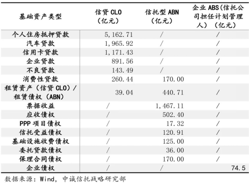 信托參與的存量資產(chǎn)證券化業(yè)務(wù)中,基礎(chǔ)資產(chǎn)結(jié)構(gòu)與新發(fā)行情況相似。根據(jù)2019年底的存量數(shù)據(jù),存量信貸CLO中,個(gè)人房貸、車貸、信用卡貸占比居于前三,個(gè)人房貸占比超過(guò)七成,三類基礎(chǔ)資產(chǎn)合計(jì)占比超過(guò)九成;存量ABN中,票據(jù)收益、應(yīng)收債權(quán)、租賃債權(quán)占比居于前三,三類基礎(chǔ)資產(chǎn)合計(jì)占比超過(guò)八成。