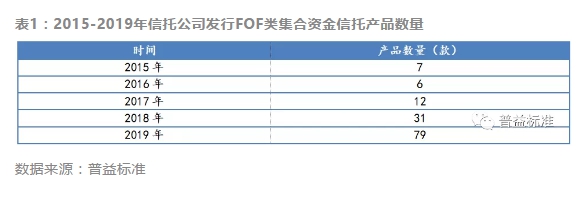 2015年,業(yè)內(nèi)真正迎來FOF產(chǎn)品大發(fā)展,全年華融信托、四川信托、萬向信托、中海信托、華寶信托均有發(fā)行集合類FOF產(chǎn)品。此后,信托公司發(fā)行的FOF類集合資金產(chǎn)品數(shù)量不斷增加——2015年到2019年,集合資金信托市場(chǎng)共計(jì)發(fā)行141款FOF類集合資金產(chǎn)品。